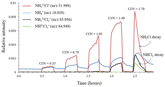 It should be noted that disproportionation of monochloramine into dichloramine (NHCl2) is possible at pH 7 [3,26]. However, no trace of characteristic NHCl2 ions was found, even though its proton affinity (PA = 757.0 ± 10 kJ mol−1) is higher than that of water [22,23]. This is likely due to the fact that the NHCl2 concentration in monochloramine solutions was below the MIMS detection limit. In order to accurately determine where NH2Cl decomposition occurs (and if it could be avoided), the sniffer route (without membrane) was used in the tests presented in the following sections.