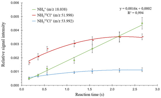 Relative ion intensities (intensity of each ion with respect to the sum of all ions) measured from a 20 mM NH2Cl solution as a function of proton transfer reaction time in headspace mode. Standard deviations are shown as error bars (n = 3).