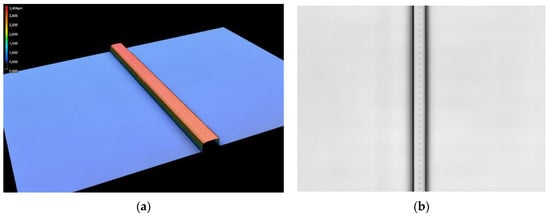 Laser scanning microscope image of the polymer waveguide after point-by-point grating inscription before applying the upper cladding. (a) The height profile of the waveguide shows dimensions of 4.841 µm width and 2.572 µm height. (b) In the top view, the single refractive index modulated points at a distance of 2.174 µm from each other can be identified.