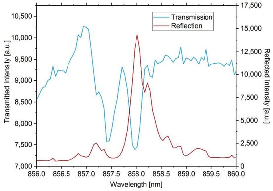 After inscription of the grating points, spin-coating of the upper cladding layer, and cutting and polishing of the edges of the sensor element, the integrated Bragg grating is evaluated for the first time. To achieve this, light of a superluminescent diode (SLED) is coupled into a single-mode fiber that is positioned directly in front of the polymer waveguide’s input and another fiber that guides the light from the sensor plate for evaluation into a spectrometer, which is positioned at the output. The transmitted spectrum is shown in Figure 2. Subsequently, the fiber is glued to the waveguide’s input and a reflection spectrum is recorded, which is also depicted in Figure 2.