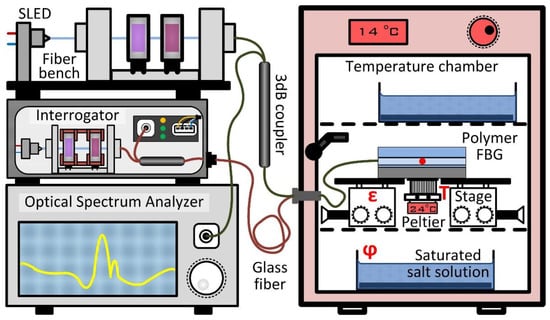 Schematic experimental setup of the investigations carried out for this work. For the polarization study, the light of the superluminescent diode (SLED) is manually readjusted in the fiber bench and guided via the coupler to the sample located inside the temperature chamber. The back reflection is evaluated using the optical spectrum analyzer (OSA). For strain characterization the interrogator with the internal light source, a depolarization unit, coupler, and spectrometer are utilized, and additionally three spectra are captured with the OSA. The sample is positioned on two translation stages, with which the tensile force is applied. The interrogator is also used for temperature measurement, where the sample is located on the Peltier element inside the temperature chamber. To characterize the sensitivity to humidity, various saturated salt solutions are placed in the temperature cabinet. The sample is again evaluated with the interrogator. Note FBG = fiber Bragg gratings.