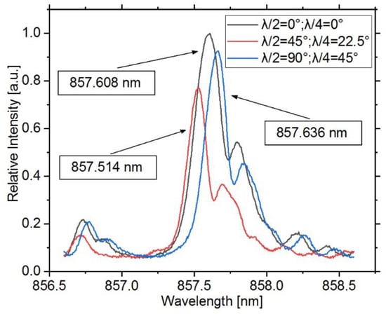 Reflection spectra for the two polarization states, which show the maximum wavelength difference of the main peak. The centers were calculated using Gauss fitting algorithms and differ by 122 pm. Additionally, the spectrum for the linear polarized starting condition is shown.