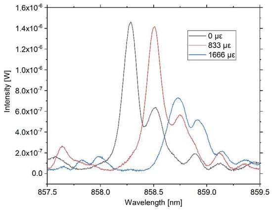 The three spectra shown in Figure 6 represent the starting condition without strain with 833 µε and under maximum load with 1666 µε, respectively. For all three strain conditions, a linear shift of the main peak to higher wavelengths is observable, although for the maximum strain condition an attenuation of the intensity occurs. It is noticeable that for the maximum strain condition, the main peak is attenuated to a greater extent in contrast to the side peak. We believe this substantiates the assumption that the Bragg condition is fulfilled for two adjacent wavelengths, whereby the higher wavelength peak expunges the lower wavelength peak due to scattering effects. Additionally, an overall intensity loss for both peaks can be seen that likely results from dimensional changes of the waveguide, essentially of its height. Nevertheless, due to the superposition of several different effects, it is difficult to evaluate individual processes with certainty and quantify them. As the effect is reversible for the strain range investigated in this experiment, and as the main peak under the high strain condition still shows an adequate intensity, mean values of the center Bragg wavelengths for each strain condition are calculated, which are shown in Figure 7.