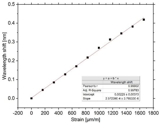 For a total lengthening of 30 µm, the Bragg sensor shows linear characteristics. While the wavelength shift for small strains of up to 833 µε is highly linear, the data points for strains greater than 833 µε show a slight deviation from the first order polynomial fitting line. We assume this is caused by the interrogation system’s performance of the Gaussian fitting, which is affected by the occurring attenuation of the spectra, as shown in Figure 6. Nevertheless, with good consistency, the strain sensitivity can be determined to be 0.26 pm/µε. Furthermore, the maximum relative deviation due to hysteresis after stretching the sensor over the full range is 3.76% (16 pm).
