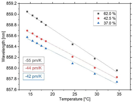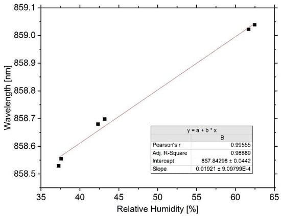 For the investigated humidity range from 37.0% to 62.0%, a sensitivity of 19.2 pm/% is determined. Under the prerequisite of ensuring sufficient time constants, a linear sensor behavior between the data points can be assumed. However, a generally linear behavior is not assured, since some polymers show nonlinearities [12].