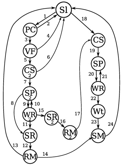 In the case of a message coming from upper layers, a new transmission is started, initiating with a CS (carrier sensing) state (transition 18). If the channel is clear, there is not any transmission taking place in the communication channel near the sender node, transition 19 changes to the SP (sending preamble) state. In this state, a preamble packet is transmitted in broadcast. By transition 20, the state is changed to WR (waiting for a reply). In this state, the MAC protocol waits for an answer from a neighbor node belonging to the FCS. When an FCS member wakes up and receives the preamble, it starts to send its own preambles ahead. The first preamble functions as an eACK packet to previous node. If there is no FCS member awake to reply with a preamble packet, the transition 21 returns the protocol to the SP state. If a reply message is received, the transition 22 leads the protocol to the state Wt (waiting ). In this state, the source node waits a computed time to send a data packet, according to the FCS cardinality. The optimal value for is determined employing the mathematical model presented in Section 5. This time is necessary to avoid collisions between the control packets (preambles) and the data packet. After this, transition 23 leads source node to the SM (sending message) state. By the end of the transmission, the protocol returns to the Sl state by transition 24.