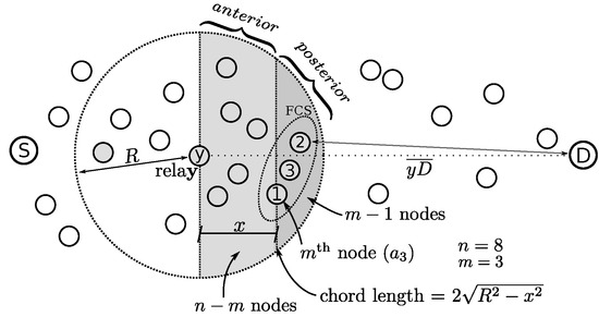 In the last section, the optimal initial delay to release data packet for a given number of hops was determined. Since the positions of source (S) and destination (D) of the packet are known, the source can estimate the number of hops necessary to reach the final destination, employing the formulation presented in this section. For that, a mathematical model for the average advancement accomplished per hop is presented. When a relay node achieve rendezvous with one of its FCS members, the FCS member starts to send its own preambles. We say preambles make a “progress”. Since the FCS member is closer to destination D than the current relay, we say the preamble takes an advancement. The advancement is the difference between the distance measured from the relay nodes to destination (D).