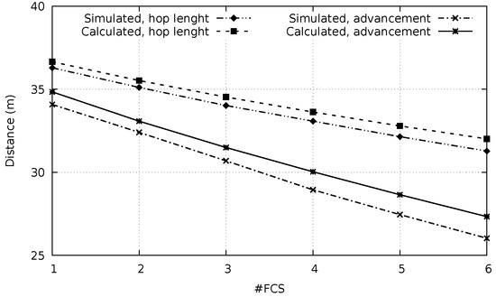 As stated in Section 4.2, the average number of preambles necessary to encounter an awake node in the FCS, in each hop is given by Equation (1):