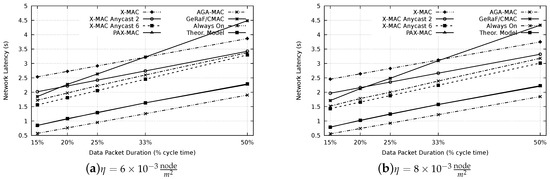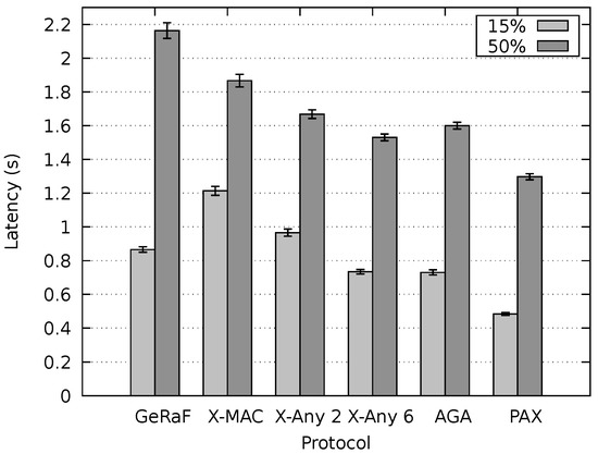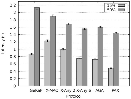The results achieved by PAX-MAC for energy consumption were lower for all tested scenarios ( and ) for the case of small data packets (15% of the cycle time). X-MAC Anycast 6 and AGA-MAC presented the best energy behavior, in average. Only for the data transmission duration of 50% of cycle time (), X-MAC Anycast 2 surpassed all the others in both scenarios. The energy consumption of PAX-MAC was close to the other protocols. In the worst case, it was only 6% above AGA-MAC for the tests performed with low and high-density scenarios. It is possible to observe a similarity between Figure 16a,b, in which the energy consumption for the low-density scenario was always higher than the consumption in the high-density scenario. However, the difference in energy consumption was always lower than 9%. The differences are due to the smaller number of hops in the high-density scenario.