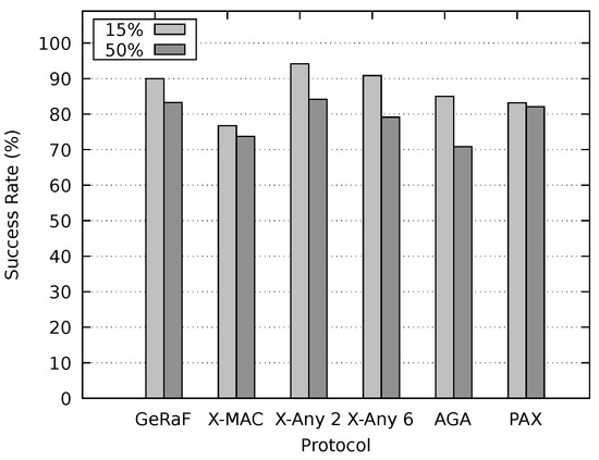 Figure 13 and Figure 14 present the packet delivery success rate for all assessed protocols considering the non-persistent and persistent modes respectively. When the persistent mode was employed, the packet delivery success rate was higher for the X-MAC and X-MAC Anycast 2 for all message sizes and PAX-MAC with large packets. This fact is associated with the small cardinality of the FCS for these configurations. Moreover, for all configurations, for a given protocol, the success rate was higher for packet duration of than for the large packets. This can be explained by the fact that larger packets are using network resources for a longer time, increasing the probability of inter-collisions.