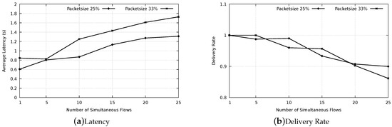 Figure 15b presents delivery rate as function of the number of flows for both packet sizes of and . The increased number of simultaneous messages yields in a lower delivery rate. It is important to remark that a limit of three attempts to transmit the data message was set. After this, the message is dropped. If more retries were allowed, an increased performance would be observed in the delivery rate, however, the latency would suffer even more.