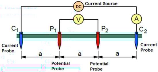 In the Wenner four-probe method, the system consists of four probes which are equally spaced (a) from each other to measure apparent soil ER [17]. The outer probes (C1 and C2) are used as the current source (I) for current injection to the soil and the inner probes (P1 and P2) are used as the voltage source to measure voltage difference (V) between the inner probes [12]. Wenner resistance (RW) between inner probes is calculated by dividing voltage by current. A Wenner configuration is shown in Figure 1. The apparent soil ER (ρE) with this configuration is calculated by Equation (1):