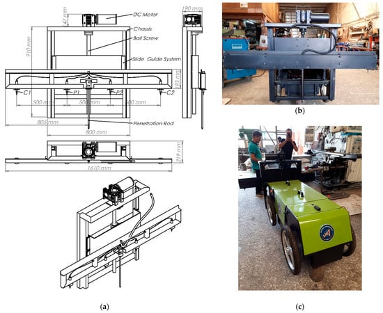 The developed measurement system. (a) Full scale technical drawing of the measurement platform; (b) full developed measurement platform; (c) four-wheel drive agricultural robot, which has the Wenner measurement system.