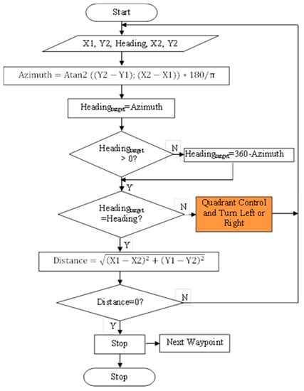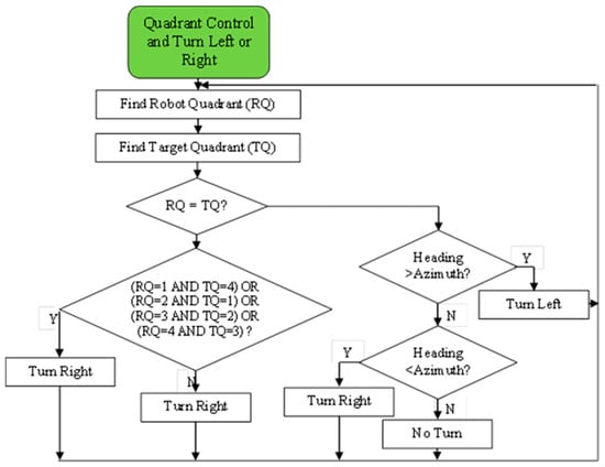 In order to operate the mobile robot both manually and autonomously, the navigation program was codded in Visual Studio.NET 2015 using Visual Basic.NET language. This program was firstly coded for two-wheel drive robots by the author in 2015 [24], and rearranged to the four-wheel drive robots for this study. However, the navigation algorithm is the same. The flowchart for autonomous drive of the mobile robot is given in Figure 3. The flowchart of the quadrant control mechanism is given in Figure 4.