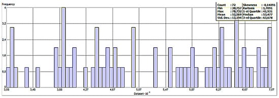 A summary of the method used for Kriging interpolation is given in Table 1. The histogram of the apparent soil ER values is given in Figure 8. As can be seen in Figure 8, the minimum value of the soil ER is 30.757 ohm-m and the maximum value is 70.732 ohm-m. The skewness and Kurtosis values were observed as −0.14091 and 1.7091, respectively. Due to the skewness value being between −1 and −0.5, the data are reasonably skewed. This would mean that the sample data for the apparent soil ER are approximately symmetric. The Kurtosis value is low (<3). This means that the data are slightly platykurtic, the lack of outliers are in data, and the extreme values are less than that of the normal distribution.