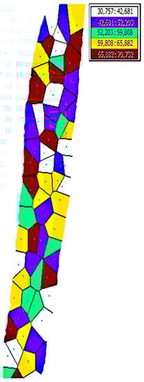In order to obtain the interpolation of the soil apparent ER values, the map of soil apparent ER on the experimental field was interpolated by using the ordinary Kriging approach. The interpolation map is given in Figure 10. Moreover, the Voronoi map of the study is given in Figure 11. It is observed that the ER values on the left side of the map are higher than the right side when the map is examined visually. This is also clearly seen on the Voronoi map of the study. If the measured points are close to each other, apparent soil ER values are approximately homogeneous. However, when the distance between the points increases, homogeneity decreases.