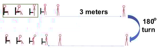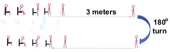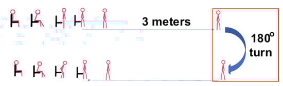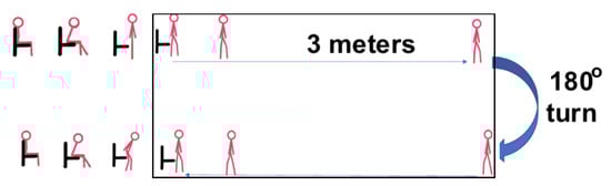 Next the participants were asked to simulate a reduced ability, or difficulty, to walk as it is often the case for patients with reduced mobility even if the distance is limited to 3 m (Figure 3). Subjects were asked to slow down in order to ensure that the time captured will be the time of the worst-case scenario (i.e., the time a geriatric elderly would need to perform this test). The aim was to evaluate the system’s ability to accurately capture the overall time, without system resets and without the sensor recording interference from the testing area.