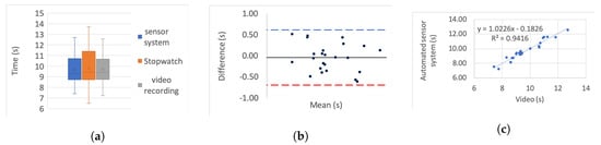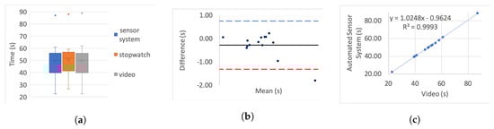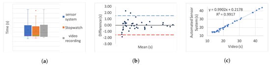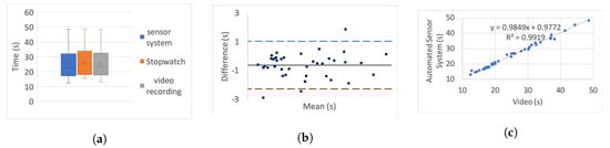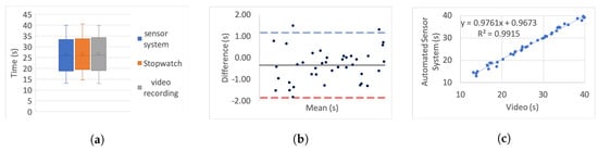 Five time sit to stand test fast simulation aggregate: (a) box plot; (b) Bland–Altman; (c) linear regression.