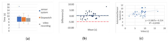 Five time sit to stand test slow simulation aggregate: (a) box plot; (b) Bland–Altman; (c) linear regression.