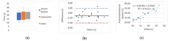 Lin’s concordance correlation coefficient () (Equation (2)) was calculated to compare the proposed automated sensor system measurements against a “gold standard” or “ground truth” measurement as one of the most well-established methods to assess agreement [], as follows: