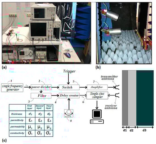 (a) The general set-up of TRM. (b) The transmitter and receiver antennas in the measurement set-up. (c) A block diagram explaining the set-up. Thickness, permittivity, permeability and conductivity of each layer can be measured by means of TRM.
