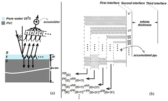 In TRM, the sample under test (SUT) in free space is periodically illuminated with a monochromatic electromagnetic continuous wave (EMCW) and the time-dependent reflected trace is captured by a narrow-band receiver (see Figure 1). As such, TRM can be categorized as a special kind of Time Domain Reflectometry (TDR) method without the need for ultra-short pulses. To simultaneously extract the thickness, complex permittivity and complex permeability of each layer, a dual-frequency illumination trace is needed [,,]. Periodic illumination is obtained by on-off keying a Single Pole Single Throw (SPST) switch arranged between the CW generator and the SUT [,]. The finite rise time of the switch introduces a step function with first-order low pass characteristics. At the receiver side, the time-dependent voltage amplitude is acquired such as in a sampling oscilloscope. In other words, in each illumination cycle, one or more samples of the transient reflection signal with an infinitesimally small time resolution are acquired. To clarify the method, we describe the procedure for a two-layer system immersed in an air environment and illuminated by an electromagnetic wave (EMW) launched from the antenna, as illustrated in Figure 2a. A first thin layer consisting of water is placed on the second semi-infinite Polyvinyl Chloride (PVC) layer, which acts as a substrate layer. In this example, for illustration purposes only, we suppose that the conductivity and relative permeability for the two layers are zero and one, respectively. Any properties related to air, water, and PVC are denoted by subscript 0, 1 and 2. The thickness of the PVC layer is assumed semi-infinite in this illustration to avoid complex time-dependent reflection patterns. The angle of the incident wave is θ. In Figure 2, we also supposed that several receivers denoted by their enumeration number n = 1, 2, 3, 4 … individually receive reflection signals from unique propagation paths (PP) of the incident EM illumination signal. We also supposed that these PPs do not mix with each other.