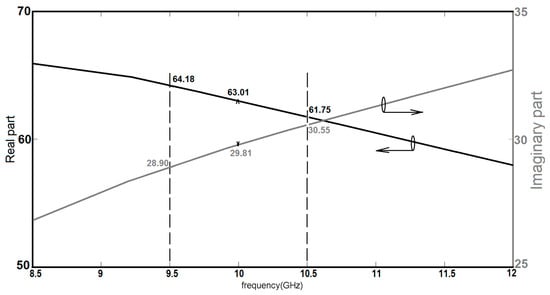 To assess the impact of material dispersion on the TRM signal, water as a most dispersive material was selected. In fact, water around 10 GHz is a worst-case scenario. In the considered simulation, a 1 GHz bandwidth instead of 700 MHz was assumed for the frequency response of the switch. In this simulation, 5 complex permittivity values of pure water at 25 °C for 1 GHz bandwidth around 10 GHz were derived from the measured data of Table 2 in []. By means of interpolation, more than 100.000 frequency-dependent permittivity points were created between 9.5 and 10.5 GHz (see Figure 3). The goal of the simulation was to investigate the impact of material dispersion on transient radar response without considering the noise floor and any other non-idealities. Simulations indicate; however, that the data points of for are already below the noise floor.