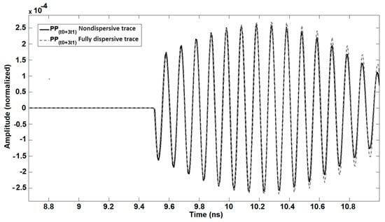 Simulation of nondispersive trace in 10 GHz and fully dispersive trace for . The amplitude is normalized.