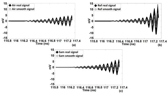 The real and smooth signals of (a) Air, (b) Ref and (c) Sam. Air is the trace due to crosstalk between the transmitter and receiver antennas, Ref is the trace generated from the PSMR and Sam is the trace generated from SUT.