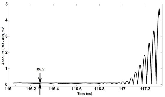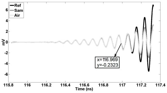 In the next step, by means of reconciling Air and Ref traces (calibration data), the nose region will be predictable. Nose refers to the specific moment that Air and Ref start to deviate from each other. For instance, the difference between the Ref and Air traces at a certain time point is less than 100 ; after a few tens of picoseconds, deviation becomes larger and larger. For a highly accurate determination of the nose, it is important to start comparing the Ref and Air traces well before the real nose trace pops up. For example, the first estimation of the nose is 116.969 ns (see Figure 6 and Figure 7). Real nose, obtained by the algorithm, happens at 117.0045 ns, and we can use this nose point for all consecutive measurements if the position and distance of the sample do not change and if drift is zero, otherwise measurements should be repeated.