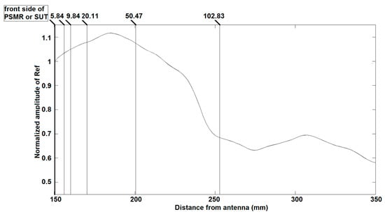 The foundation for the extraction of data (layer thickness and dielectric permittivity) from TRM is based on the exact knowledge of the PPs. Although expressions exist to predict the distance-dependent power density along the propagation axis in the far-field (classic beam divergence) and even in the near-field (very nonlinear) for Gaussian or spherical beams, in this work, the distance-dependent power density was experimentally recorded every 0.1 mm, starting from the position of the SUT up to a distance at least four times the electrical thickness of the SUT (see Figure 9). In this way, a reference table quantifying the propagation divergence is created. It is clear that accuracy is improved by decreasing the sliding steps. The sliding back away of PSMR from the transmitter and receiver antennas induces a delay and attenuation that can be easily observed on an oscilloscope. As such, for the validation of the beam divergence compensation algorithm, the trace recorded for the PSMR located at 40 cm from the antennas can be rebuilt by Ref trace, obtained when the PSMR is located at only 15 cm by applying the appropriate delay and attenuation factors on the Ref trace that is recorded from PSMR at 15 cm. This means that the phase of Ref trace is not changed by the sliding, as was experimentally confirmed in [] where we used a unique as a constant amplitude for all . The pattern of the power density for the monochromatic case and for isotropic materials has not been changed, but it will be compressed as a result of any refractive index n > 1. In order to mitigate the error due to divergence and the angle of two antennas, one should calculate the physical path that the wave propagates in the MLS. Then, based on this physical path, the amplitude will be determined based on Figure 9. For instance, amplitude coefficients of the , and can be calculated as follows: