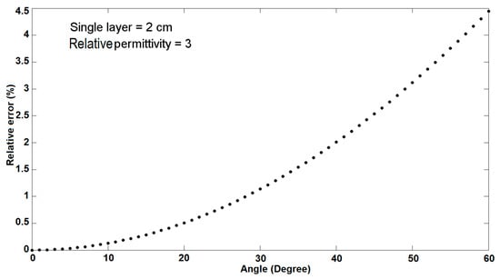 Relative error versus the angle between the two antennas for a 2 cm thin single-layer structure with relative permittivity equal to 3.