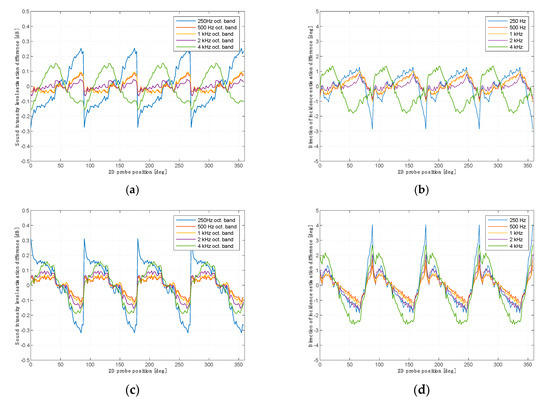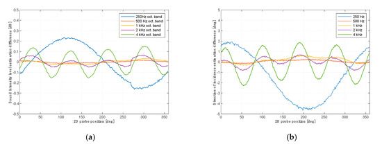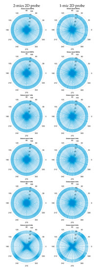 Figure 6 shows the distribution of the intensity vectors recorded during the probe’s incremental angular position change with reference to the sound source. Column (a) shows the results for a two-microphone probe and column (b) shows the results for a single-microphone probe. The following lines present characteristic rosettes determined for subsequent octave bands in the range from 250 Hz to 8 kHz. Such imaging of the results allows to better recognize the qualitative differences between the tested methods.