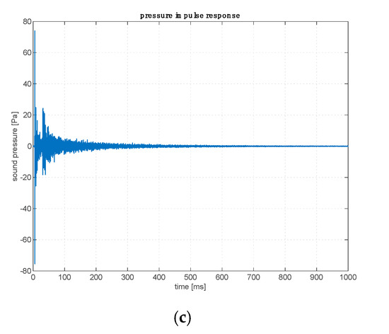Based on the above analyses, a Genelec 8040 speaker set was used as a source of sound in the experiment. It was powered by the signal of an exponential sweep tuned in the range of 20 Hz–20 kHz. Its duration was 10 s. Parameters of data acquisition devices remain the same as in the previous experiment. Figure 9 shows the view of the examined room and the location of the measurement probe and loudspeaker set and its standard pressure impulse response.