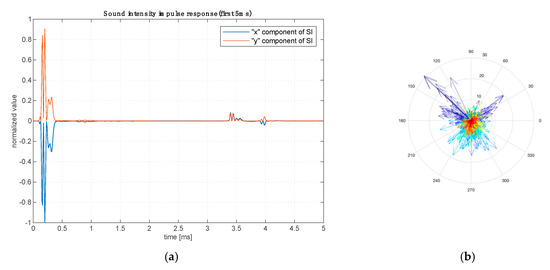 Figure 10a shows the first 5 ms fragment of the obtained sound intensity impulse responses of the examined room for both components of the vector. We can see the direct sound impulse and first early reflections. Figure 10b shows the time evolution of the successive portions of energy reaching the probe using a color scale for the whole response. The dark blue color indicates direct sound and first reflection and finally the red color indicates the last reverberation tail.
