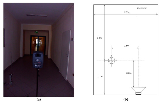 An omnidirectional sound source should be used to measure the impulse response. ISO 3382-1 describes in detail the parameters to be satisfied for a sound source to be considered omnidirectional. The most common source with parameters close to omnidirectional is the dodecahedron speaker. In work [24] can be found a description of other sources that can be used as alternatives to a dodecahedron speaker. The authors also mention the popular electrodynamic loudspeaker which, although it does not meet the requirements of the standard for omnidirectionality, gives sufficient results in numerous acoustic measurements. It is especially important that the electrodynamic loudspeaker is able to generate many times an acoustic field of identical parameters, which enables the use of averaging and increasing the signal-to-noise ratio—SNR (as opposed to, e.g., a gun or a pierced balloon). This transmitter is also characterized by its low price, which is particularly important for measuring systems that are to become more popular. In some measurements, such as speech intelligibility and distortion, a directional sound source is better than an omnidirectional sound source, as stated in the IEC 60268-16 international standard.