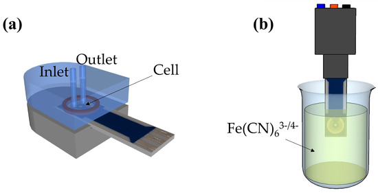 (a) Sketch of the fluidic cell used for an effective interaction of the solutions (Abs, BSA and E. coli) with the electrode and (b) scheme used for the electrochemical measurements: the AuSPE was dipped in a beaker containing 1.5 mL of Fe(CN)63−/4− and it was connected to the potentiostat through a holder (in grey) for the impedance/current measurements.