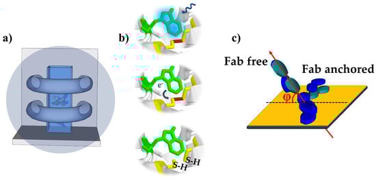 (a) UV lamp used for the UV activation of the antibodies. Emitting wavelength: 254 nm, diameter of each lamp: 1.5 cm, dimensions internal: space 1 cm × 1 cm × 4 cm, power of each lamp 6 W, irradiation intensity 0.3 W/cm2; (b) Description of the reaction involved in PIT: the UV photon energy is adsorbed by tryptophan and transferred to near cys-cys. The result is the cleavage of the disulphide bridges and the formation of new thiol (SH) groups; (c) Antibody is immobilized onto the surface so that the angle φ is 45° on average thereby providing one Fab free and well-exposed to the environment.