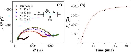 In the photochemical immobilization technique, the Abs are conveyed to the electrode after they have been irradiated by the UV lamp. Since the activation of the Abs only lasts approximately 5 min [57], it is necessary to optimize the time the solution is fluxed in the cell containing the working electrode (10 µL volume). The results obtained with a flow rate of 6 μL s−1 are reported in Figure 3a (see Table S1 for the data), that shows EIS spectra measured at intervals of 15 min, which are required to cover the whole surface. The resulting Rct is shown in Figure 3b and its behavior with the time is well fitted by an exponential function with time constant of 13 ± 1 min. Thus, the whole functionalization procedure can be considered accomplished in one-hour time. Since no significant change of Rct is observed after the blocking step, we can assess that the saturation of Rct shown in Figure 3b corresponds to an electrode fully covered by antibodies.