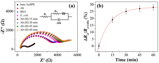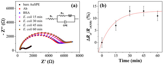 We also measured the kinetics of the Ab binding to the E. coli from the top (sandwich configuration) by carrying out EIS as a function of time during the flow of a 25 µg mL−1 Ab solution into the cell. The Nyquist plots are reported in Figure 5a and the corresponding values for Rct are shown in Figure 5b (see Table S3 for the data) with an exponential fit of the data that provides a constant time of 13.5 ± 0.3 min. Once again, 30 min can be considered a recommended value that allows the accomplishment of the amplification step.