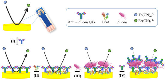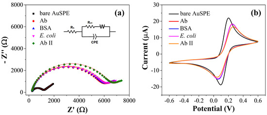 Cyclic voltammetry (CV) and electrochemical impedance spectroscopy (EIS) measurements were carried out to investigate the layer by layer construction of the immunosensor and to verify the E. coli binding (Figure 6). Both characterization techniques investigate the electron transfer process and, specifically, the changes of charge transfer resistance caused by the adsorption of isolating molecules to the gold electrode. EIS plots of the step-by-step immunosensor fabrication are shown in Figure 6a, utilizing 10 mM Fe(CN)63−/Fe(CN)64− as redox probe in 0.01 M PBS buffer.