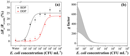(a) Dose-response curve obtained using both protocols: DDP–direct detection protocol and BDP–ballasting detection protocol. The experimental data are fitted by Equation (6); (b) Gain factor g as a function of the E. coli concentration.