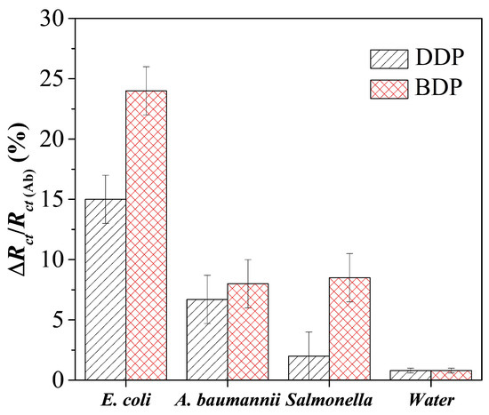 Specificity of the immunosensor in 10 mM Fe(CN)63−/4− solution at pH 7.4. ΔRct/Rct(Ab) induced by 105 CFU mL−1 E. coli in comparison with the negative control (drinking water) and non-target bacteria (Acinetobacter baumannii and Salmonella enteriditis 706 RIVM).