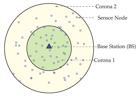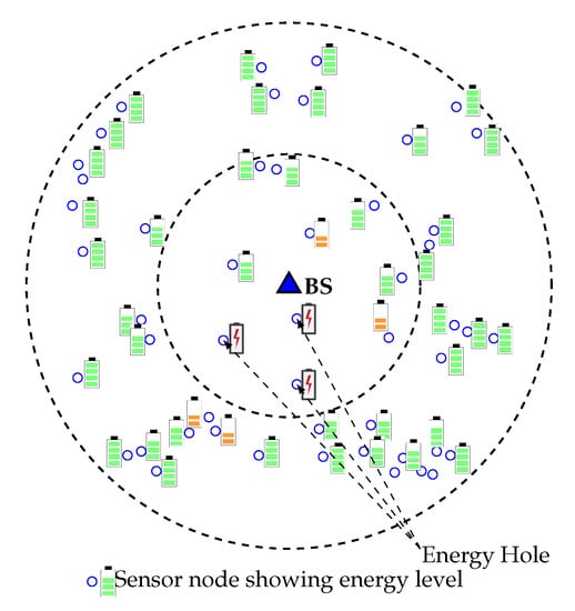 Wireless Sensor Networks (WSNs), a collection of a large number of resource constraint sensor nodes [], are widely used in applications like environment monitoring, military surveillance, disaster forecasting, agriculture, remote patient monitoring, factory automation [,,], etc. In such applications, the main task of the sensor nodes is to collect the relevant data from the environment and send this gathered data to the Base Station (BS) or sink through multi-hop communication. Nodes closer to the sink or BS in multi-hop WSNs need to transmit or forward more traffic than other distant nodes of the network. This topological disadvantage makes the closer nodes drain out their energy at a significantly higher rate, which may create energy holes in the network [].