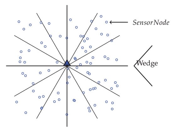 In order to partition the network into equiangular wedges, the BS directs its antenna to one portion of the network and transmits a wedge_creation packet that contains sink ID and a wedge number. This packet is send out with its maximum transmission power level, to ensure coverage of every node in that direction. When a node receives a wedge_creation packet with a wedge number, then it assigns its wedge to that wedge number, unless it has already joined an equal or lower wedge. Until all nodes get its wedge number from the BS, this wedge creation method continues by both changing the angle of directionality and wedge number by 1. Figure 3 is showing a network with wedges. Here, the entire network gets divided into 12 wedges.