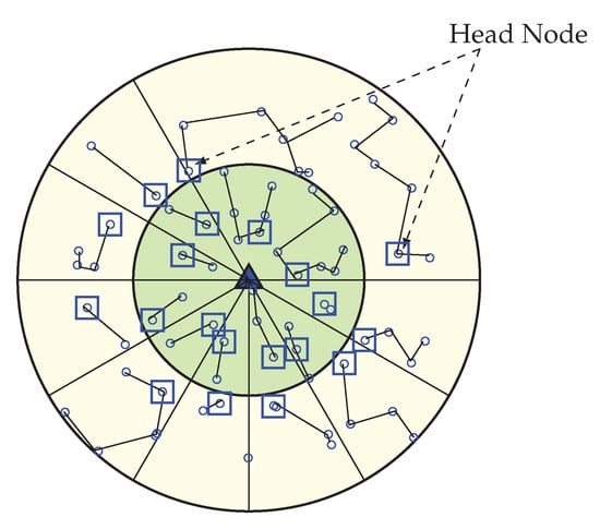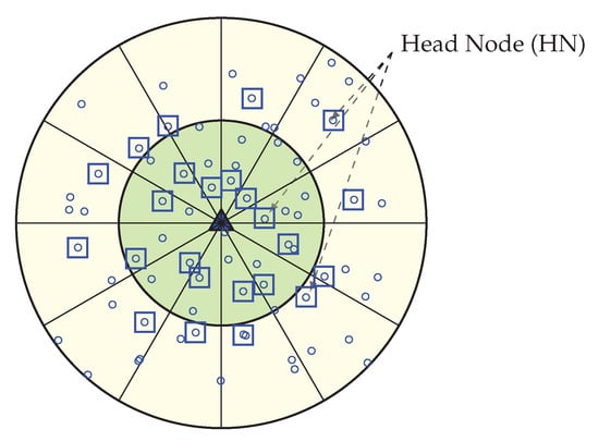 Here is the RE of the node, is the threshold distance obtained from Equation 1, is the distance between the node i and its successor head node (in case of ), is the distance between the node i and the BS (in case of ). The HN selection procedure starts from the corona 1. Here, every node set a timer () where is divided by the summation of RE () and distance factor (/), so that higher residual energy and less distance node can send earlier within the total advertisement time (). After receiving sensor nodes that are in the same sector, the node leaves the competition and nodes that belongs to the successor sector calculate the distance based on the RSSI of the packet. Node belongs to Corona 2 sets their timer according to Equation 3 and in the same procedure node which has high residual energy and less distance between the predecessor HN sends packet. Figure 6 is showing the Head Node for every sector. This HN selection process run at every round in order to select the most capable node as HN, and until any node becomes more capable, the same HN can operate for many continuous rounds. If any node becomes better than the current HN of its sector again, a new HN selection phase is called and the most suitable node become new HN. The pseudo-code of the head node selection procedure is shown in Algorithm 1.