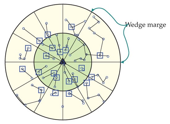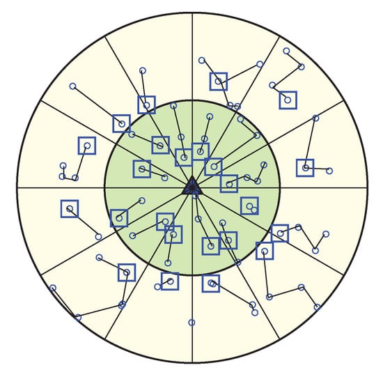 After wedge merging, every node calculates their distance with the other nodes of the sector. If the maximum distance between two nodes is greater than , then, according to the distance, more HNs can be selected for that sector. As width of corona one and corona two is not same, two different distance thresholds are used. For corona one, the distance threshold is 30, whereas for corona two, the distance threshold is 45. Figure 12 is showing two HNs in a sector.