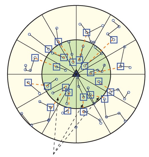 Multiple HN selection procedure is similar as single HN selection type, however, the difference is that, in order to make a certain distance between the HN when the first HN selects, it sends to its sector within transmission range . The nodes who receive this message can not participate for any other HN selection competition during this round, and the node who did not receive any message continues the head node selection procedure in order to be the second HN for a sector. This procedure continues until all nodes receive . Figure 13 is showing the scenario of HN when all wedges merge in the network. After the HN selection procedure, in order to construct a chain, nodes join to the HN which is closest to it. The chain construction and data transmission technique is the same as a single HN procedure type.
