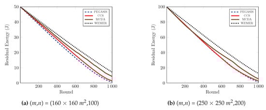 Table 2 shows the parameters used in the simulation. A homogeneous sensor network is assumed, in which all sensor nodes have equal sensing and processing capabilities initially. Each node has the initial energy of 0.5 Joule, and the length of the data message is 4000 bits. Our selection of these values is highly motivated by [,,,,]. Each sensor node has location information, and no mobility is taken in account to mean that nodes are static in nature. In the proposed scheme, the data is passed through a multi-hop approach.