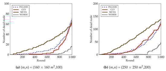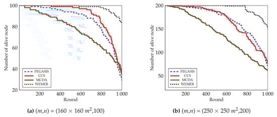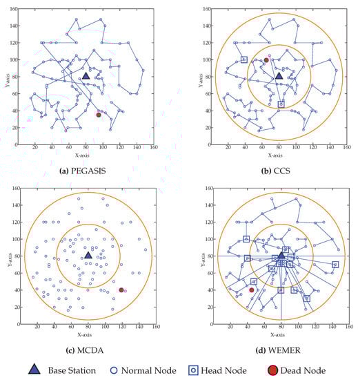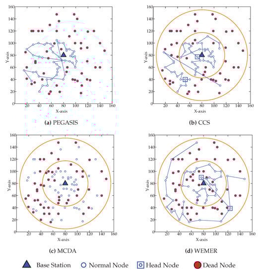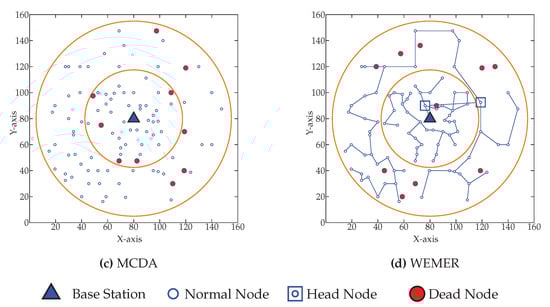 Figure 20 shows the network topology when fifty percent of nodes die. Figure 20a shows that fifty percent node dies at 945th round in PEGASIS. Figure 20b–d show that the same percentage of nodes die for CCS, MCDA and WEMER at 951st, 987th, 1128th round respectively.